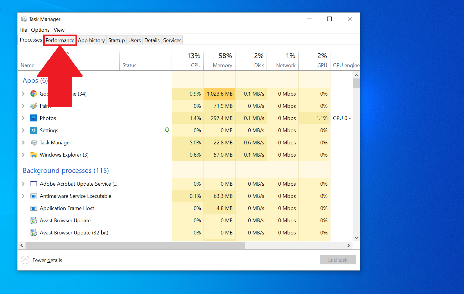 1. Ctrl + Shift + Esc 키를 눌러 작업 관리자를 엽니 다. 다음으로 성능 탭으로 이동합니다.