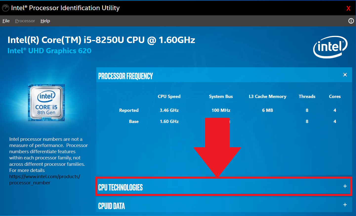 3. 이제 아래와 같이 CPU Technologies 탭을 클릭합니다.